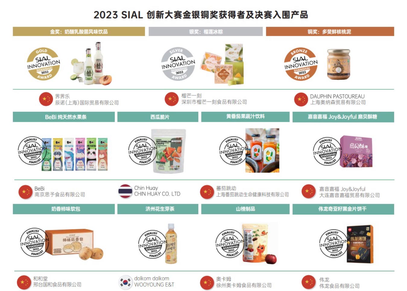 在 2023 SIAL西雅展創(chuàng)新大賽(上海站)的評(píng)選活動(dòng)中,累計(jì)收到全球參賽產(chǎn)品共計(jì)600余款,118款創(chuàng)新產(chǎn)品獲得入圍,所有入圍產(chǎn)品已在2023 SIAL 西雅展(上海)創(chuàng)新大賽展區(qū)展示。其中,榮獲金銀銅大獎(jiǎng)的3款產(chǎn)品和11款決賽入圍產(chǎn)品在2023SIAL西雅展(上海)開展首日正式發(fā)布,榮獲金銀銅獎(jiǎng)項(xiàng)的產(chǎn)品更將在 SIAL Network 全球12站巡回展出,共享全球創(chuàng)新趨勢(shì)。