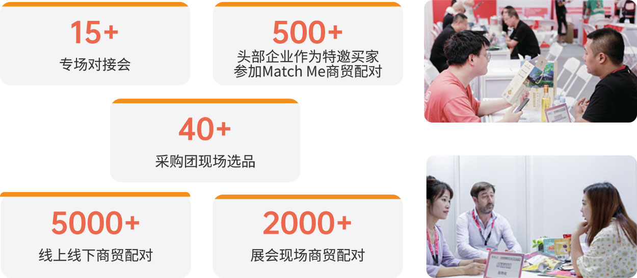 | 2023 SIAL 西雅展(深圳)為 600+ 展商和 500+ 特邀買家提供 Match Me 供需對接服務,通過展位配對、團長選品區、大買家洽談間和對接會等多種形式為供需雙方成功搭建精準、高效的貿易橋梁,現場共完成 5000+ 商貿配對場次。 |
