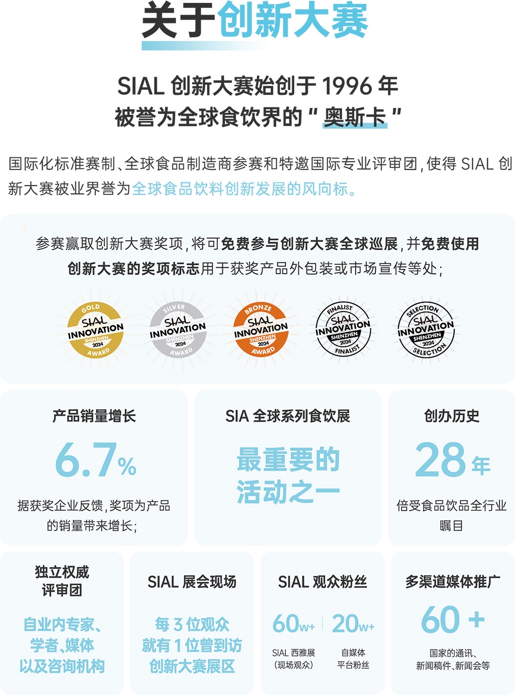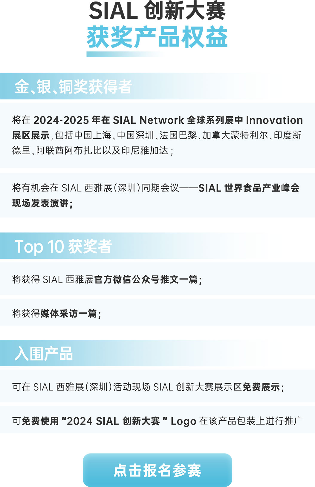 報名產品數500+,最終35件產品入圍,獲得金銀銅獎項的產品將在2024-2025年度SIAL全球巡展創新大賽展區進行展出。