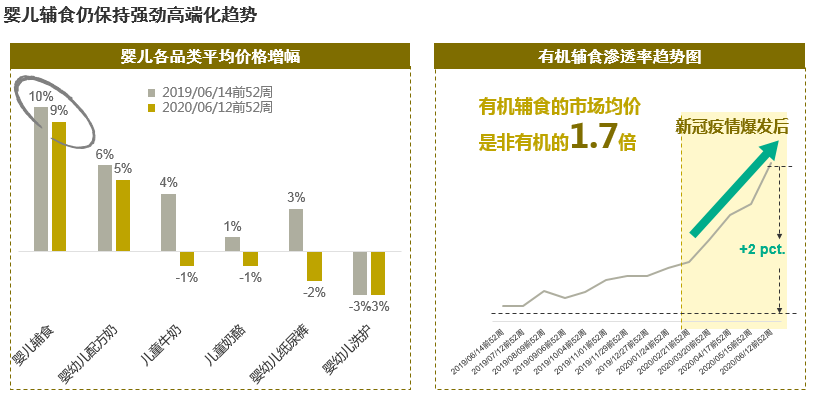 盡管品類增速趨緩,市場仍有強勁的發展機會。嬰兒輔食平均價格增速高達9%,位居各嬰兒品類之首,且高端化態勢持續。而有機輔食是推動高端化的一大驅動力,它的均價是市場平均的1.7倍,從數據可看出有機輔食的滲透率持續攀升且在疫情后加速增長。