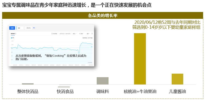 從數據中可以看到,適合添加在輔食中利于寶寶成長的核桃油、牛油果油、兒童醬油在14歲以下的有孩家庭中迎來了快速發展,因此,品牌商也可從廣義的輔食或嬰幼童食品市場,找到增長的切入點。