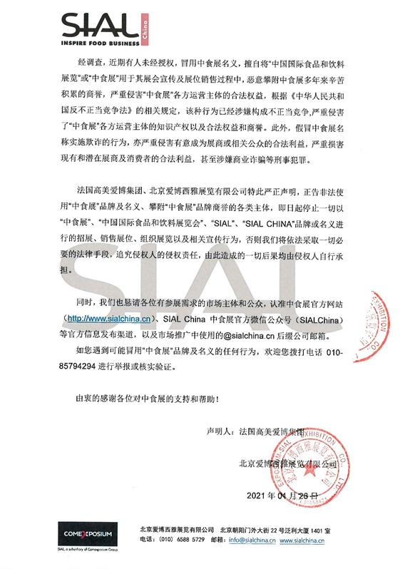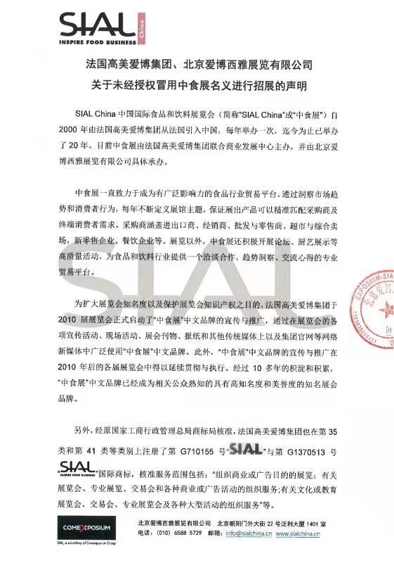法國高美愛博集團、北京愛博西雅展覽有限公司特此嚴正聲明,正告非法使用“中食展”品牌及名義、攀附“中食展”品牌商譽的各類主體,即日起停止一切以“中食展”、“中國國際食品和飲料展覽會”、“SIAL”、“SIAL CHINA”品牌或名義進行的招展、銷售展位、組織展覽以及相關宣傳行為,否則我們將依法采取一切必要的法律手段,追究侵權人的侵權責任,由此造成的一切后果均由侵權人自行承擔。