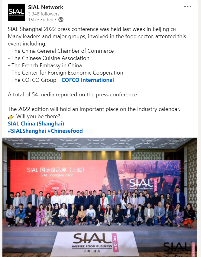 SIAL 2022 國際食品展(上海)在SIAL全球食品展官方LinkedIn賬號上獲得了法國、巴西、羅馬尼亞、阿根廷、阿聯(lián)酋、土耳其等國家食品品牌、貿(mào)易代表、合作伙伴的點(diǎn)贊