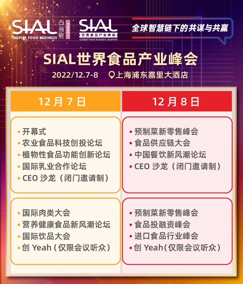 SIAL世界食品產業峰會將于2022年12月7日-8日如期舉辦!峰會將以“全球智慧鏈下的共謀與共贏”為主題舉辦包含預制菜、新零售、供應鏈、農業食品科技、食品投融資、營養健康食品、植物性食品、乳業、肉類、飲品、中餐、進口食品在內的多場主題論壇。