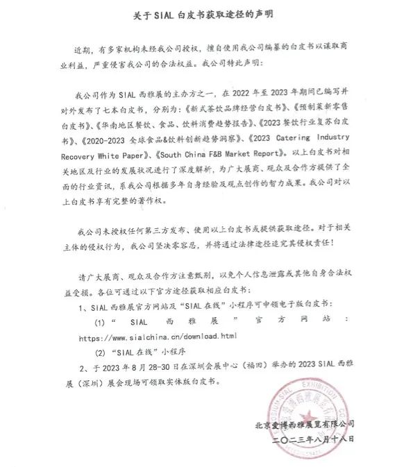 2、于2023年8月28-30日在深圳會(huì)展中心(福田)舉辦的2023 SIAL西雅展(深圳)展會(huì)現(xiàn)場(chǎng)可領(lǐng)取實(shí)體版白皮書。