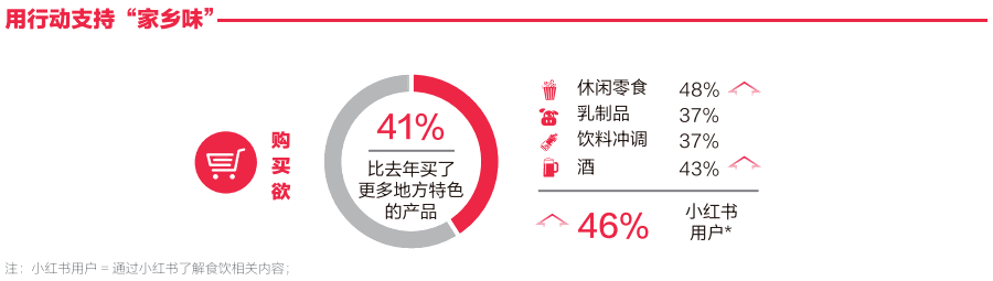 消費者不僅被地域產(chǎn)品的獨特性吸引,還正在用實際行動支持地域特色,購買地方特色產(chǎn)品的頻率明顯提升。41%的消費者表示自己在去年買了更多地方特色的產(chǎn)品,且小紅書用戶更偏好購買這些地方特色產(chǎn)品。